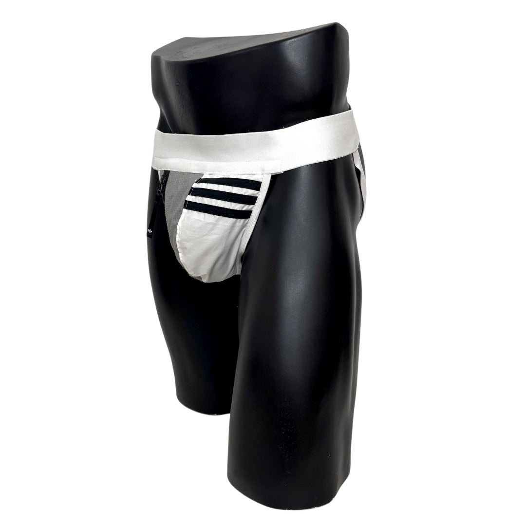 Our totally unique Adidas Jockstrap, handmade from an up-cycled Adidas tracksuit jacket. Besides the authentic fabric from the tracksuit, we finish this customised product with high premium quality elastic bands around the waist and on the side, as well as the pocket with the zipper closure on the side.