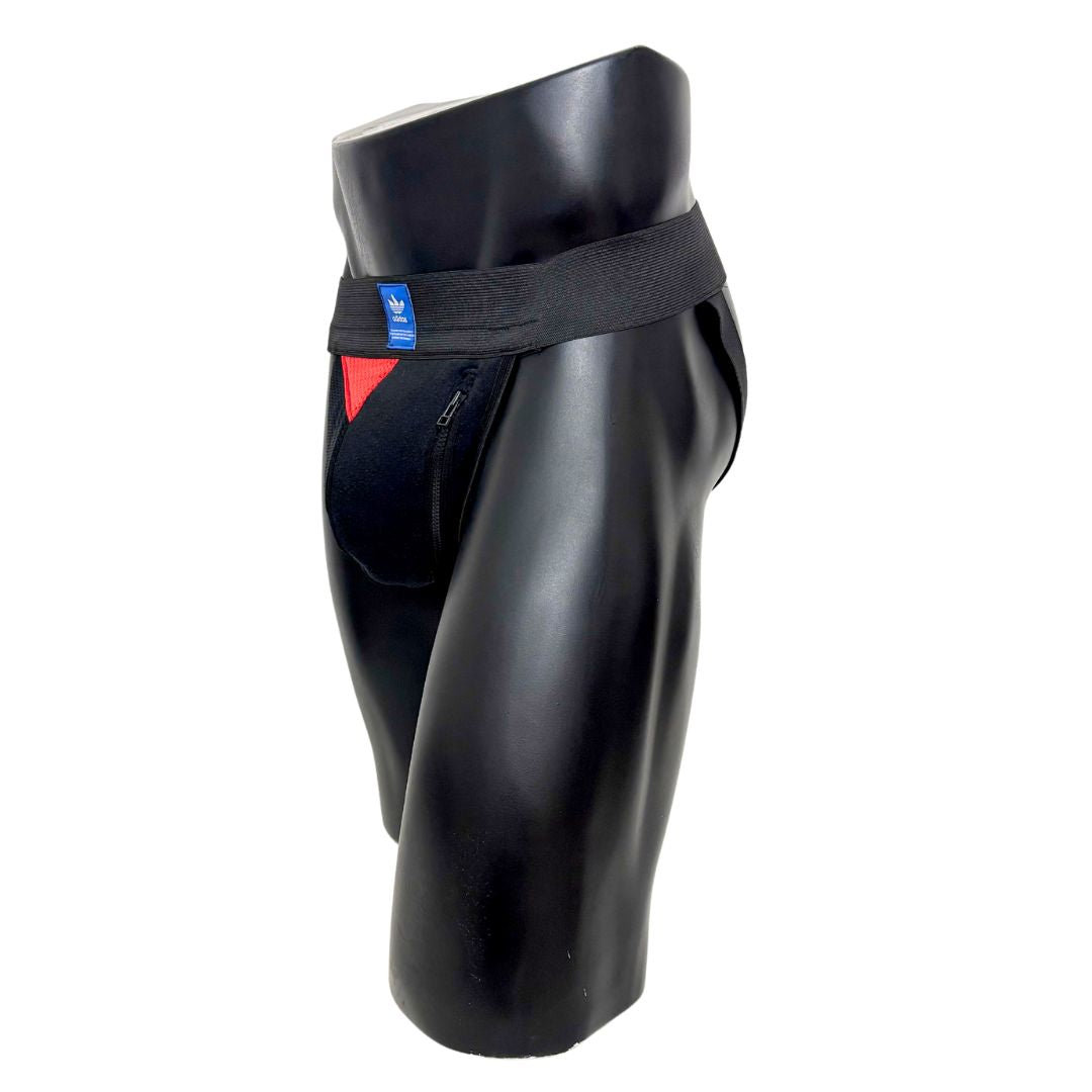 Our totally unique Adidas Jockstrap, handmade from an up-cycled Adidas tracksuit. Besides the authentic fabric from the tracksuit, we finish this customised product with high premium quality elastic bands around the waist and on the side, as well as the pocket with the zipper closure on the side.