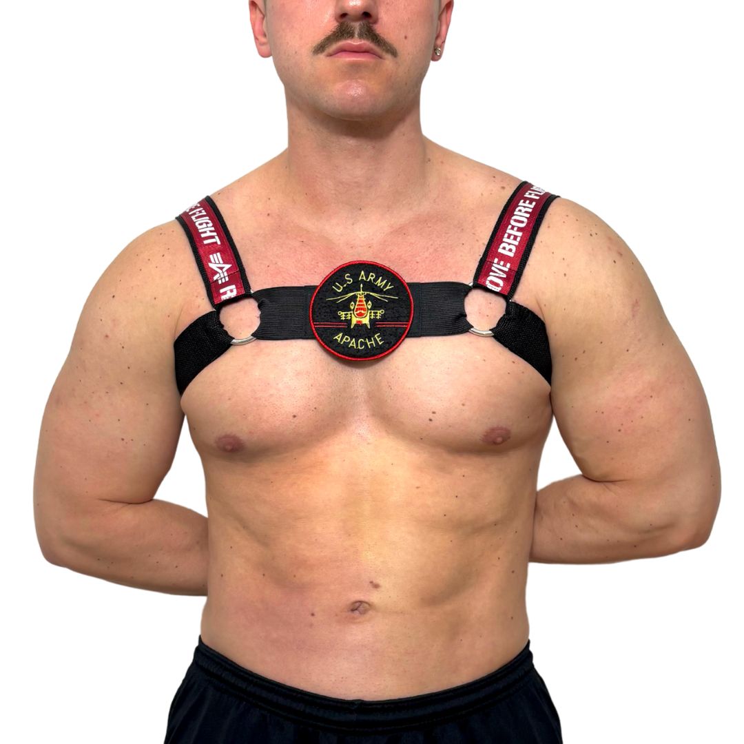 Our totally unique Alpha Industries Harness handmade from up-cycled, vintage Alpha Industries bag and embellished with details from an Alpha Industries bomber jacket. Besides the authentic material from the bags, we finish this customised product with high premium quality elastic bend and titanium rings which provide adaptability.