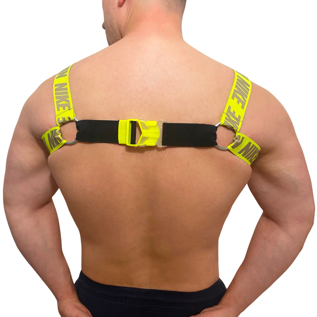 Our totally unique Nike Air Neon Green Harness handmade from up-cycled Nike waist bags. Besides the authentic material from the bags, we finish this customised product with high premium quality elastic bend and titanium rings which provide adaptability. You can wear it in two different ways since it’s reversible.