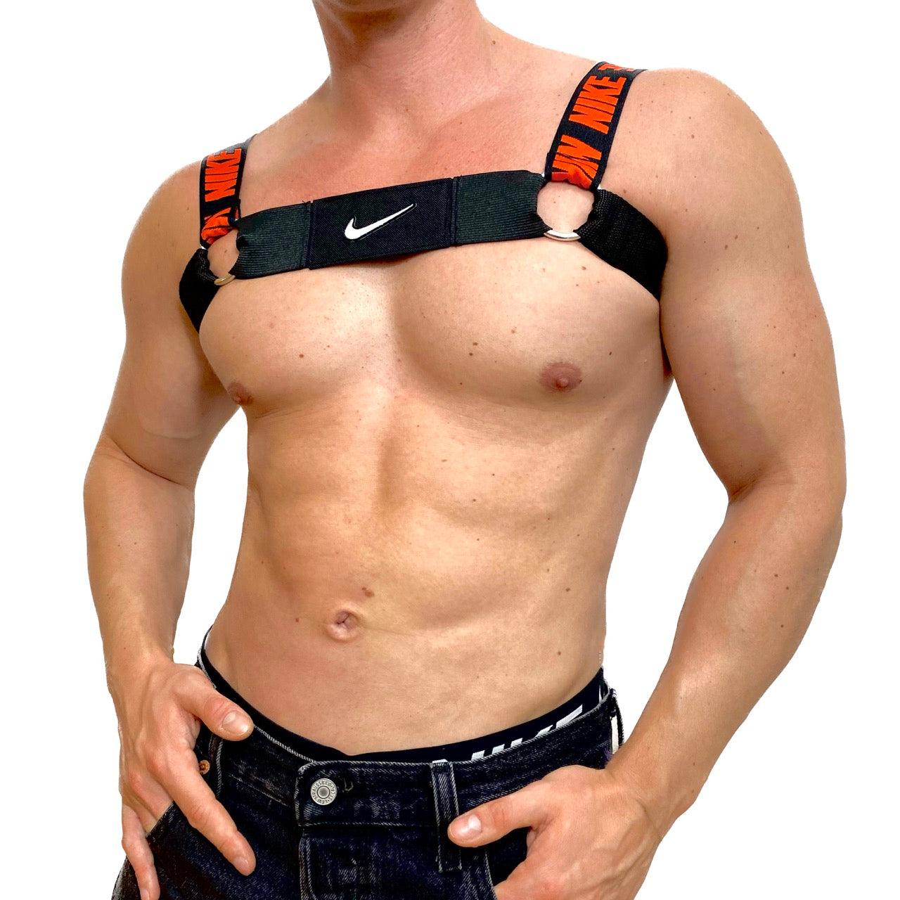 Our totally unique Nike Air Max Sport Black/Orange Harness is handmade from up-cycled Nike waist bags. Besides the authentic material from the bags, we finish this customised product with high premium quality elastic bend and titanium rings which provide adaptability. You can wear it in two different ways since it’s reversible.