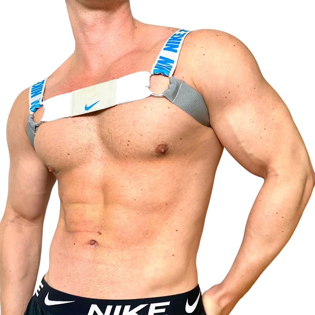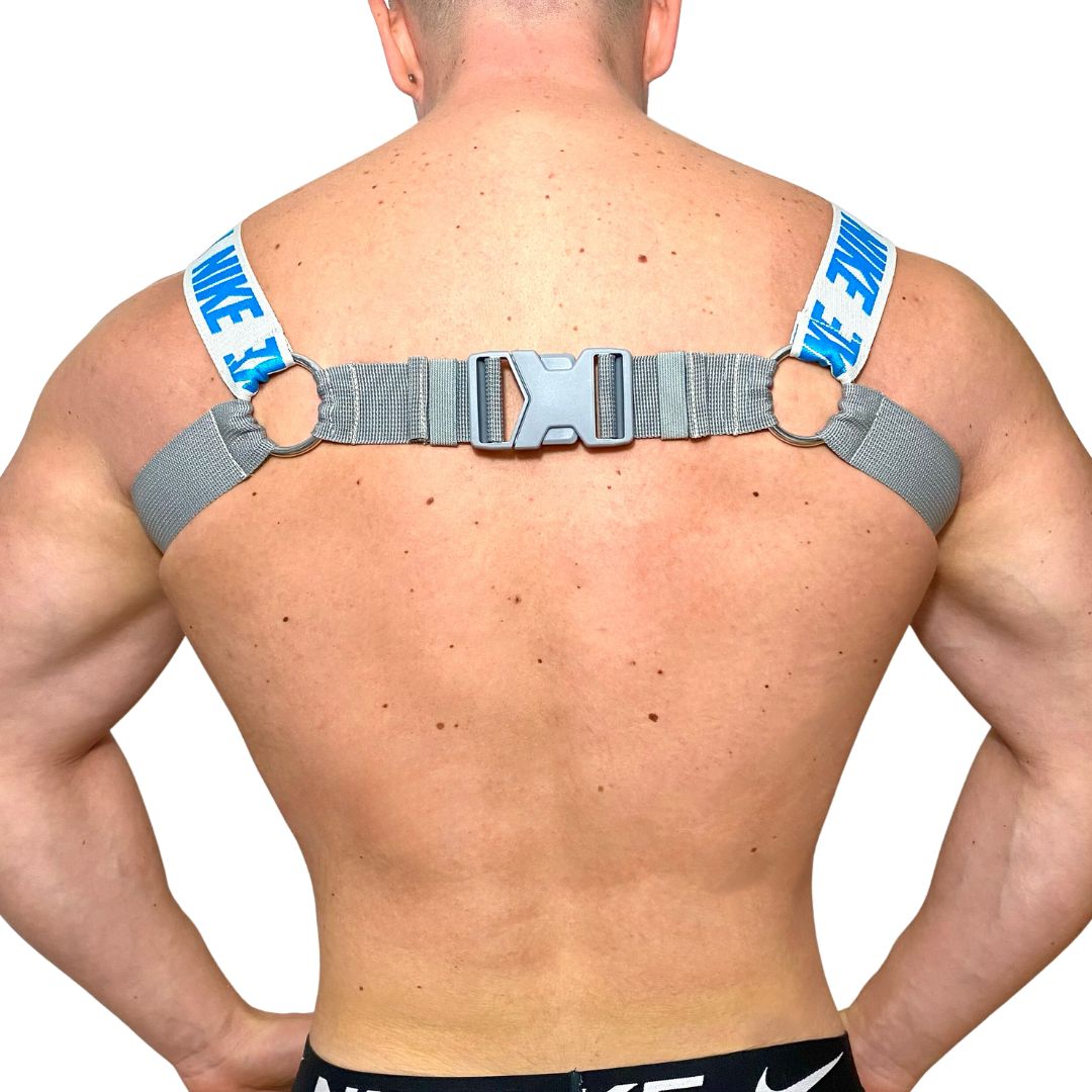 Our totally unique Nike Air Max Sport Blue Gray Harness is handmade from up-cycled Nike waist bags. Besides the authentic material from the bags, we finish this customised product with high premium quality elastic bend and titanium rings which provide adaptability. You can wear it in two different ways since it’s reversible.