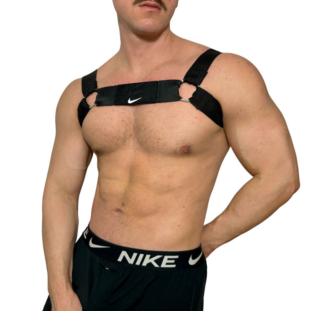 Our totally unique Nike Air Max Three Logo Black Harness handmade from up-cycled Nike bags and tracksuit. Besides the authentic material from the bags, we finish this customised product with high premium quality elastic bend and titanium rings which provide adaptability.