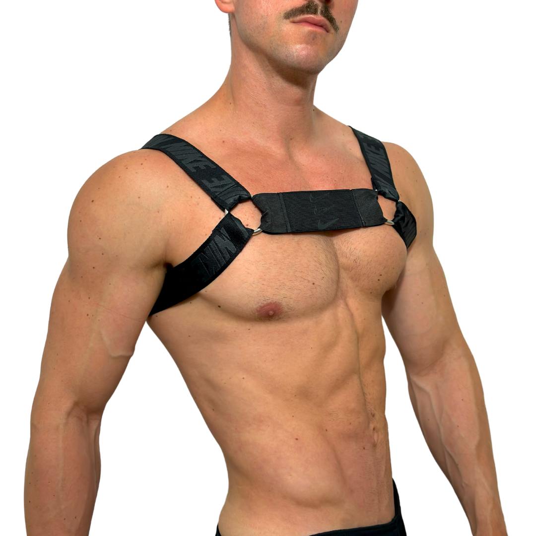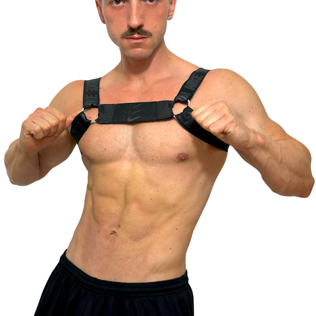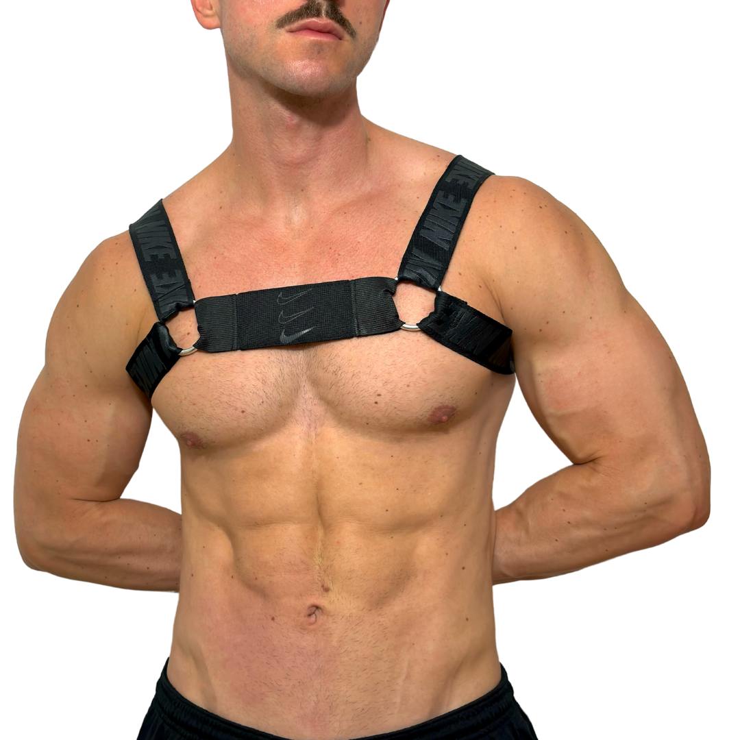 Our totally unique Nike Air Max Three Logo Black on Black Harness handmade from up-cycled Nike bags and tracksuit. Besides the authentic material from the bags, we finish this customised product with high premium quality elastic bend and titanium rings which provide adaptability.