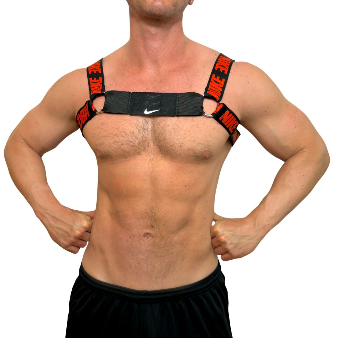 Our totally unique Nike Air Max Orange Harness handmade from up-cycled Nike waist bags. Besides the authentic material from the bags, we finish this customised product with high premium quality elastic bend and titanium rings which provide adaptability. You can wear it in two different ways since it’s reversible.