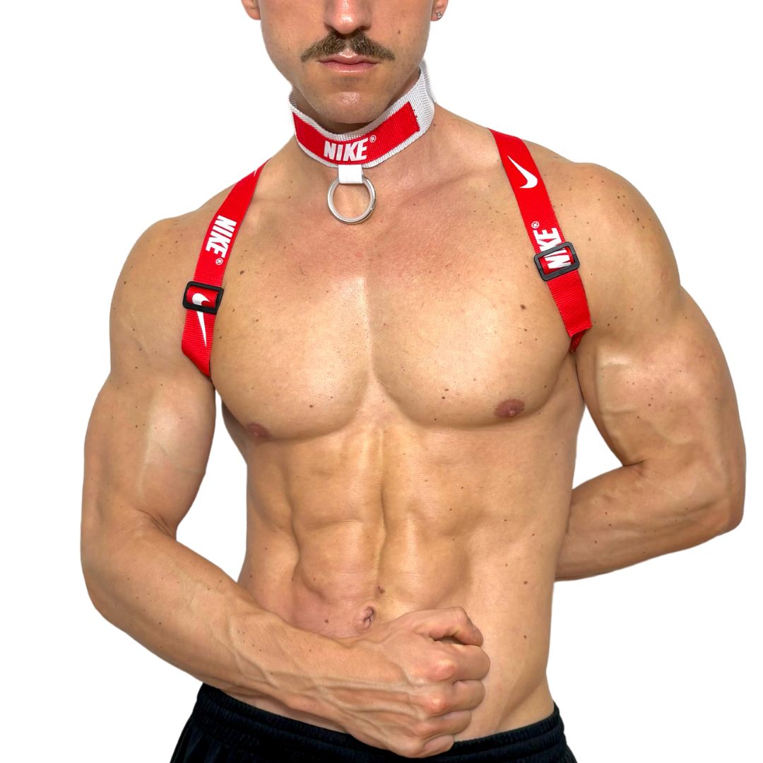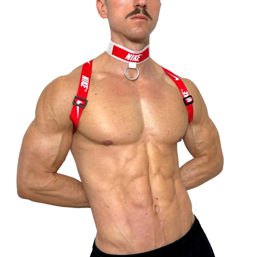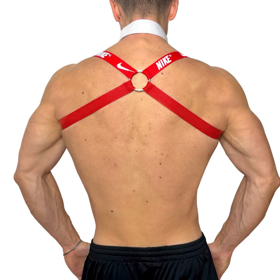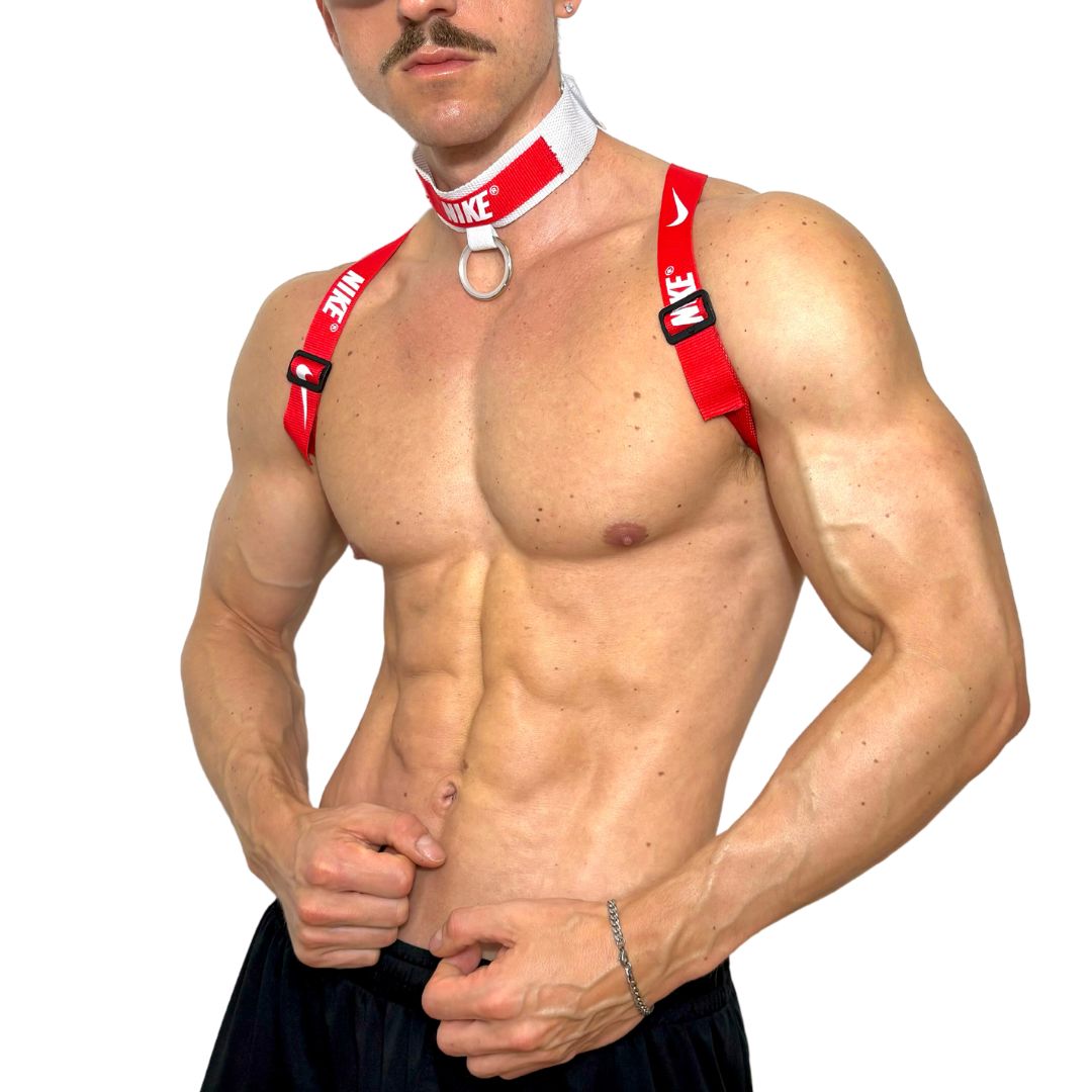 Our totally unique Nike Sport Harness and Choker Set is handmade from up-cycled Nike waist bags and keychains. Besides the authentic material from the bags, we finish this customised product with high premium quality elastic bend and titanium rings which provide adaptability.