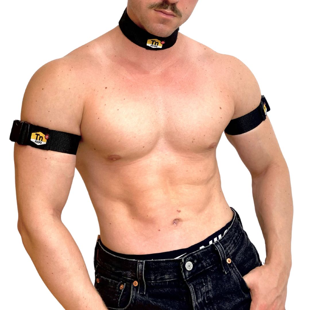 Our totally unique Nike Tn Black Choker and Arm Bands Set handmade from up-cycled Nike waist bags. Besides the authentic material from the bags, we finished this customised product with high premium quality elastic bend and titanium rings which provide adaptability.