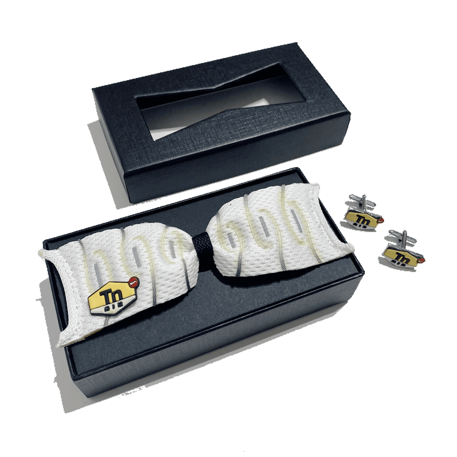 Our totally unique Tn Bow Tie and Tn Cufflinks, handmade from up-cycled Air Max Tuned original sneakers. Besides the authentic fabric from the sneakers, we finish this customised product with a high premium quality neckband which can be adjusted using the slide buckle.